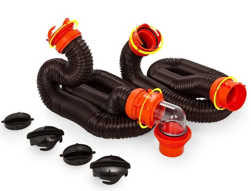 There are a few other things you might need as well, like adapters and extensions (the above kit comes with some of these) – we strongly recommend flexible rubber funnel connectors, (which sit like a rubber seal between the hose and the campground pipe). The rubber ones work best, as during freezing or changing temperatures, the hard-plastic ones can get difficult to remove as they expand with the weather. We also like to use a clear elbow connection at the end of our sewer line (which connects to the previously-mentioned funnel connector), as opaque ones prevent you from seeing the water as it travel into the sewer pipe (This is important if you want to ensure your water is flowing correctly, the hose is not clogged, and to know when the water has stopped flowing and you can move on). And don’t forget about camping gloves and diggers (for when you need to unclog the hose), and ALWAYS use disposable gloves when handling any of the hoses, lines, connectors/adaptors, and even the expanding support trelices (another thing to consider, as many campgrounds do not permit the sewer hose to touch the ground). Below, we’ve highlighted some of the best sewer hoses and accessories on the market so you can make an informed decision about what to take on your next RV trip.